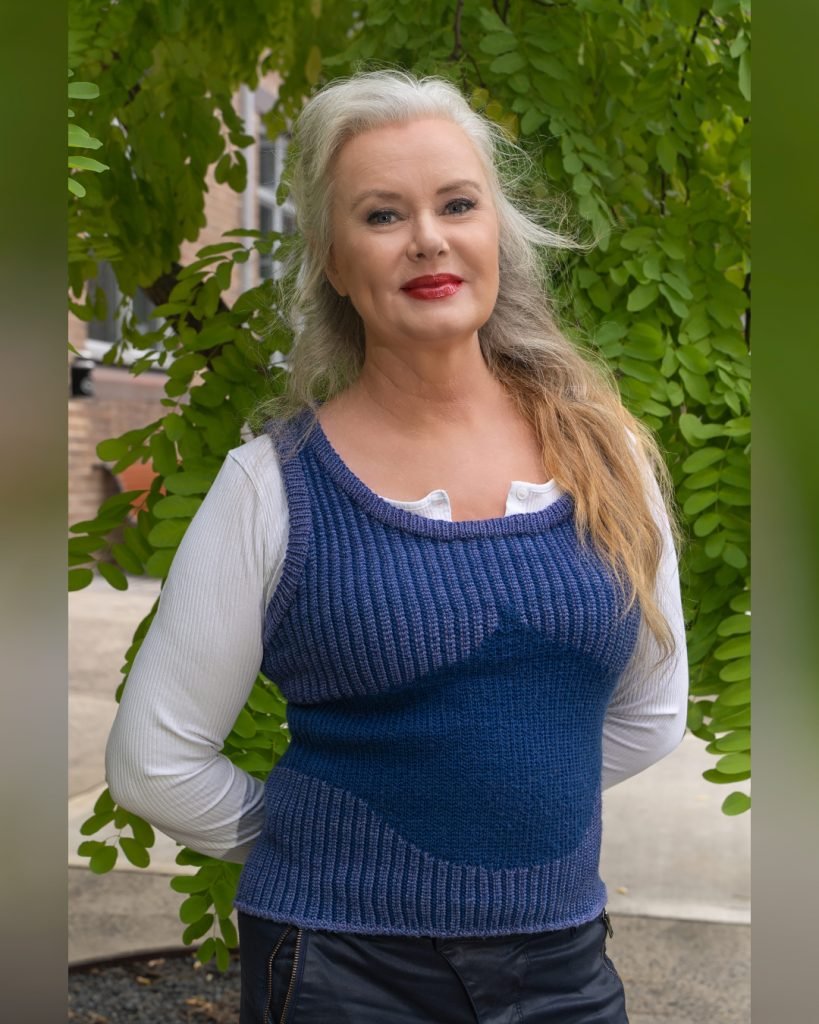 In her book, Edith described how proportions are very important to keep a body shape and size to scale. When designing for a petite figure, go for small handbags, belts, gloves, hats and motif patterns on the textiles. The opposite is needed for the larger sizes thus, for this particular vest with it’s tiny pinstripes, it will always look best on small to medium size bodies. If the pattern was knitted for a larger size it would simply make the wearer look larger … which is generally not the goal. If I’d designed a garment with wide vertical stripes or an oversized motif, I would not release the pattern for smaller sizes for the same reason.